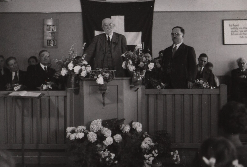 In the summer of 1937, President Grant toured Europe to speak to Church members, including stops in Switzerland and Germany.[87] While in Frankfurt, Germany, on July 8, 1937, President Grant spoke to almost a thousand people gathered in a local community center.[88]