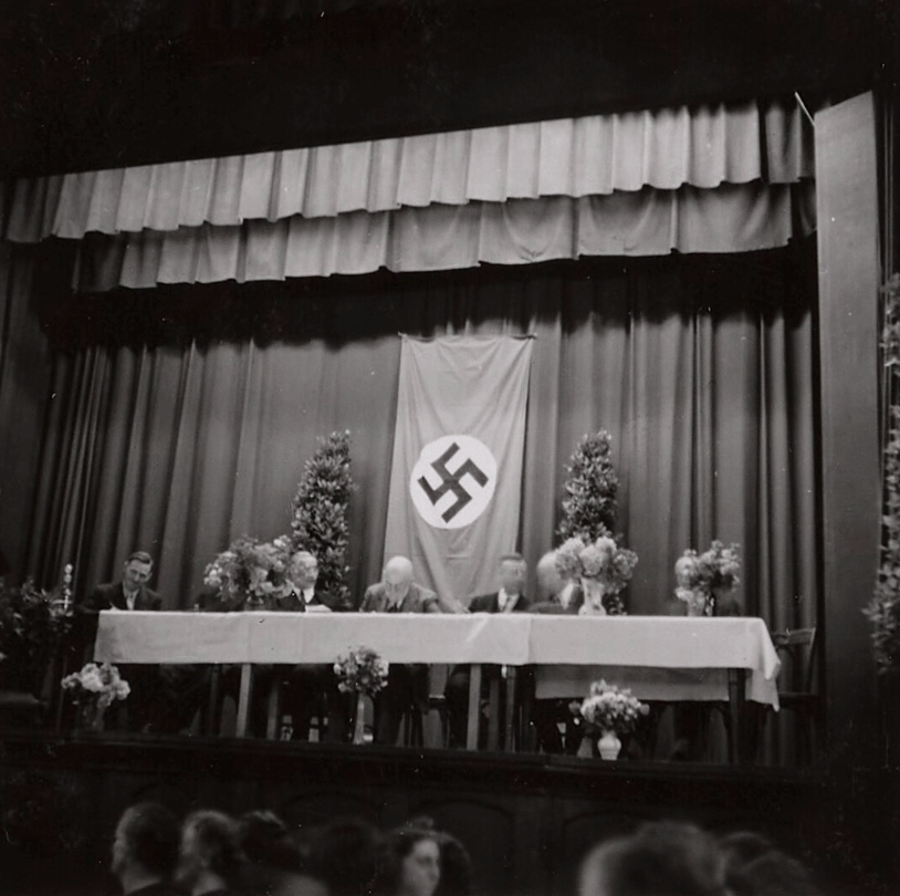 The venue, owned by local Nazis, displayed the swastika flag, which was the national flag of Germany at the time.[89][90] Similarly, other photographs from that speaking tour show President Grant addressing Swiss members of the Church in front of the flag of Switzerland.[91]