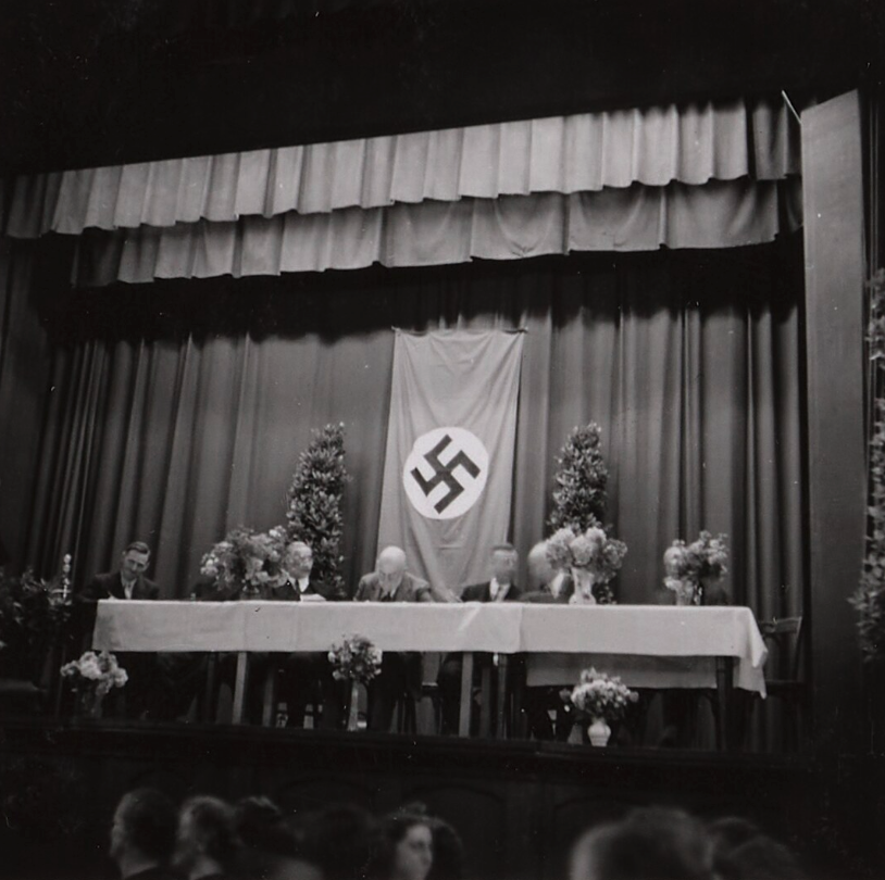 The venue, owned by local Nazis, displayed the swastika flag, which was the national flag of Germany at the time.[89][90] Similarly, other photographs from that speaking tour show President Grant addressing Swiss members of the Church in front of the flag of Switzerland.[91]