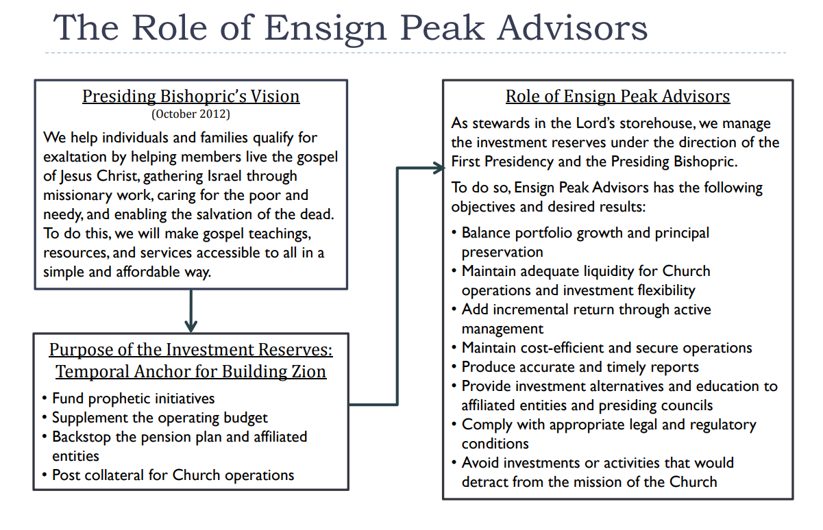 The Church describes the reserve fund as insurance so the Church's mission can continue despite financial hardships.[84] Reportedly, EPA refers internally to its investment reserves as a "Temporal Anchor for Building Zion" (see image below).[85] On 60 Minutes, Bishop Waddell described EPA's fund as "the Church's treasury," emphasizing the fund was for the Church's continued operation and the future, or "how many years' worth we have in case of financial difficulties, in case of financial crisis, to make sure that we can continue church operations."[86]