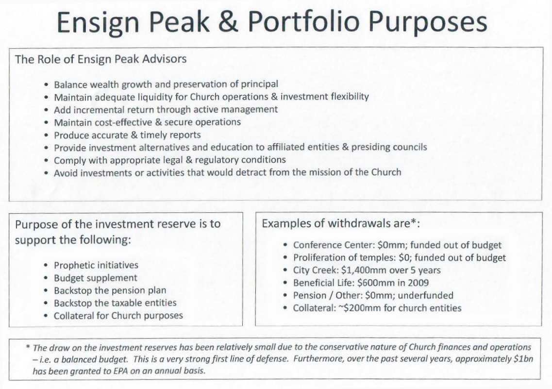 The Church describes the reserve fund as insurance so the Church's mission can continue despite financial hardships.[84] Reportedly, EPA refers internally to its investment reserves as a "Temporal Anchor for Building Zion" (see image below).[85] On 60 Minutes, Bishop Waddell described EPA's fund as "the Church's treasury," emphasizing the fund was for the Church's continued operation and the future, or "how many years' worth we have in case of financial difficulties, in case of financial crisis, to make sure that we can continue church operations."[86]